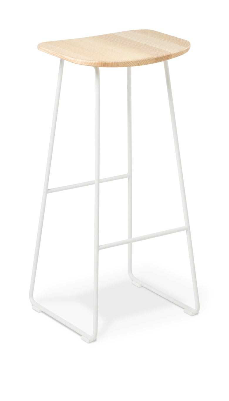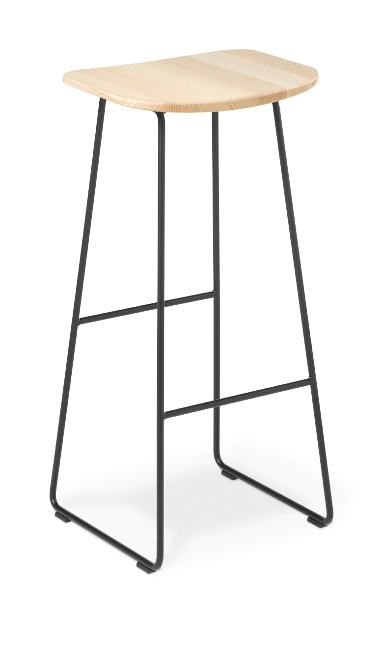 Klein features a solid Ash timber seat with comfortable shaping and refined finishing. The sturdy sled rod steel frame has a versatile compact footprint and alternate height foot supports. It is available in bar and kitchen heights with two frame colour options. An upholstered seat pad is optional.